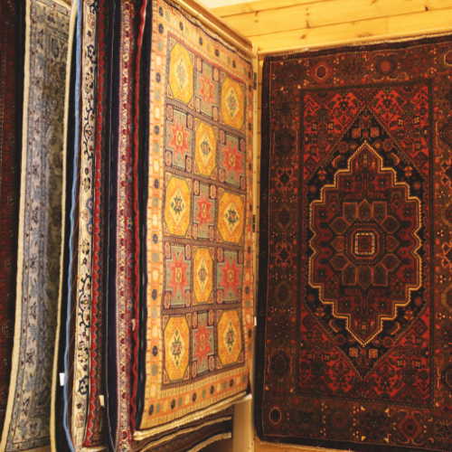 実店舗では多数のペルシャ絨毯、ギャッベ、キリムを常時展示しています。ホームページ掲載商品を実際にご覧頂けるほか、未掲載の商品や掘り出し物も。経験豊かな専門スタッフがご相談も承ります。ご予約等は不要ですので、お気軽にお立ち寄りくださいね。