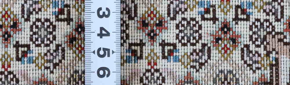 ひし形の枠に囲まれた小さな花を三日月型にしなる葉と幾つもの小花で包んで繰り返す花格子「ヘラティ」はイラン各地のペルシャ絨毯で幾多ものバリエーションを見せますが、タブリーズの工房で織られる精密なヘラティは別格の美しさを讃えられ、「タブリーズのマヒ模様」と呼ばれて区別されています。