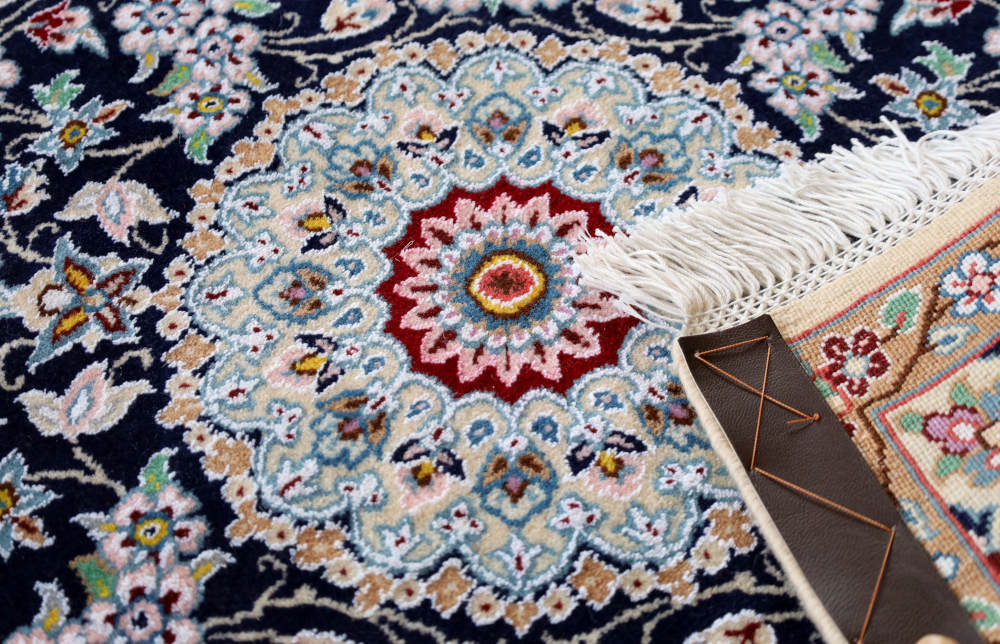 砂漠に囲まれたオアシス都市ナインは、上質なペルシャ絨毯の産地として広く名を知られています。 澄んだ明るい色彩と洗練された文様が愛され、殊にウールの毛足に少量のシルクを織り込むデザインは秀逸です。