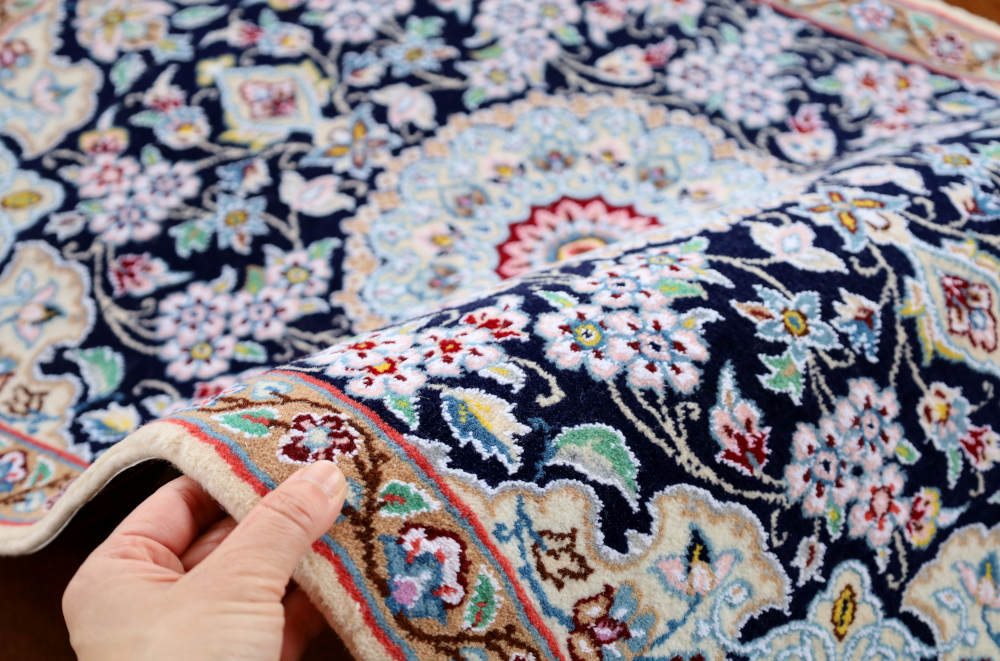 藍色の静けさをかき消すほどに、いちめんを澄んだ彩りで埋め尽くす愛らしい花々。 深い地色に文様の淡い色彩が美しく照り映える、イラン中西部の町・ナインのペルシャ絨毯です。