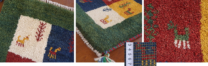 ![]() このギャッベの側面裏側には人工皮の帯がついています。 (通常は薄手の絨毯の補強として付けられるものです。) ※左の写真のギャッベ絨毯は上記商品とは別のギャッベです。 |