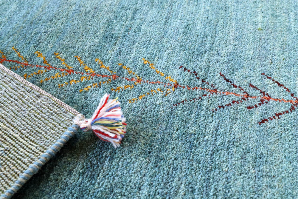 たおやかに伸び茂る植物をゆらりと透かす水の色。独特な染めの技法によって織りなされた色模様が繊細な表情を広げるギャッベ絨毯です。