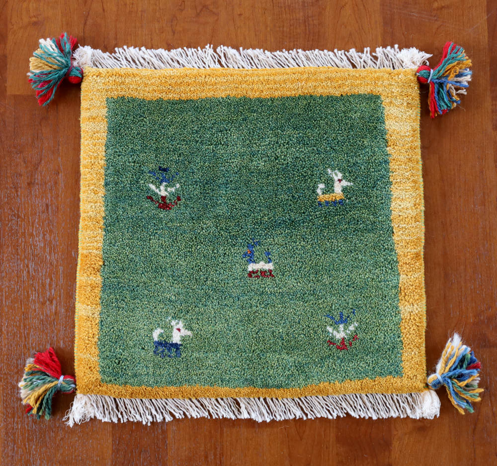 ふっかりとした手触りと、気持ちのいい厚みを生かしたギャッベのお座布団。こんなにちっちゃいのに作りは大きな絨毯と同じ、そしてミニサイズなので、織り手の遊び心満載です。