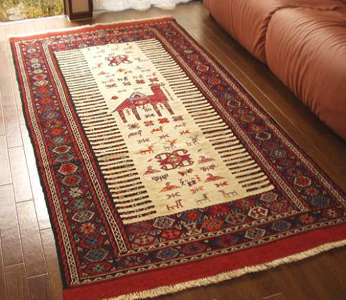 渋く素朴な色が特徴のグーチャンですが、このキリムは端の茶色と模様のオレンジ、そしてすきっと抜けた真ん中の白(淡いクリーム色)がとても明るく軽やかで、垢抜けています。