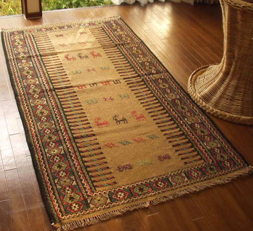 イラン北東部の町、グーチャンのキリムです。クルミの皮などで染める渋みのある色合いと、平織りの上に少し太い色糸で刺繍のようにモチーフを織り込む技法が特徴です。素朴な手触りや少し具象的なモチーフに、自然の息遣いを感じさせるキリムです。 モチーフも色合いもぱっちりとした、華やかな一枚。織り目は細かくとてもきれいで、全体にきっちりとした美しい印象です。ソファー前やベッドの横、窓辺などいろいろ使えるちょっと長めのサイズです。