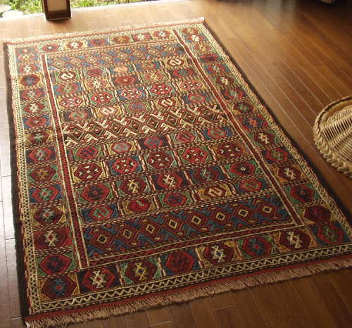 このキリムは黒っぽい平織りの部分は新しい糸なのですが、モチーフのジジム織りの色糸は古いジャジム(反物のように長く織るキリムの一種)の糸をほどいて使用してあります。時を経て新たなキリムとして蘇った糸のところどころの色あせに、何とも言えない感慨を覚える一枚です。