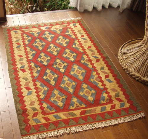 やわらかな色調の一枚。中央のダイヤ模様の青は、よく見ると途中から水色に切り替わっています。全体に少し日に焼けたような茶色みをかぶり、太目の糸でざっくりと素朴に織られたキリムです。少し広めの玄関のマットや、汚れが目立たないのでキッチンの周辺などにも。
