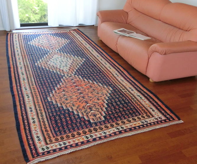| (→)主体となる藍と赤、オレンジに緑の染め色は年月を経て赤とオレンジが共に褪め、溶け混じり合うことによって、緑の艶を秘めた藍と夕映えのグラデーションの美しいコントラストに昇華されています。 藍の中に無数に漂う水草のような植物は一つ一つに藍の亜種のような青緑、濃淡の抑揚を揺らす赤をたたえてある種の版画のような幻想的な色表情を広げています。 中央の2重のひし形を埋める水鳥は上下のひし形の薔薇の間にも至る所に混ざり込み、時には葉の一部のように変形して植物に同化しそうな息遣いを感じます。 詰んだ織り目は使い込まれて馴染みあい、表面はキリムの無骨さがこすれてさらりとした手触りになっています。平織のぺたりとした厚みは持ち上げてみると意外なほど重く、弾性のあるしなやかな質感が床にぱたりとよく落ち着けます。大切に使われたものとみられ全体に傷みはほとんど見られず、両面ともに表として使うことができます。 ゆったりとした大きさと精密な文様が視線も心も惹きつける、堂々とした存在感を誇るオールドキリムです。 |