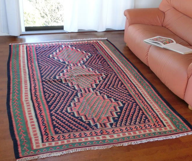 | 丸みを帯びた文様は染め色の寄せては返すふわりとした濃淡や、ゆらゆらと左右に振れる枠模様の縦の連なりにさざ波のような動きを与えられ、華やかな見栄えに泉のような涼やかさを感じさせます。 全体にはよく詰んだ横糸によって厚みが生まれ、端をつかんで持ち上げてみるとコットンのたて糸によるくにゃりとした柔らかみと、しんなりとした糸の重みが手に伝わります。 織り足し部分のほかには左下の端に手のひら大の新たな補修部分と、横糸の小さな擦り切れが全体の数か所に見られます。表面は使い込まれて目が押され、毛羽立ちが和らいでさらりとした手ごたえになっています。 ソファーセットやダイニングセットの足元などに。曲線を帯びたやわらかな輪郭も美しい、クルド族のオールドキリムです。 |