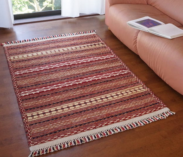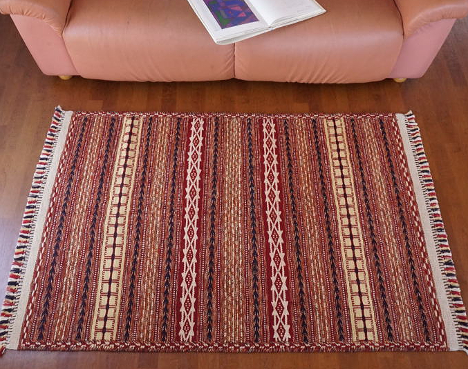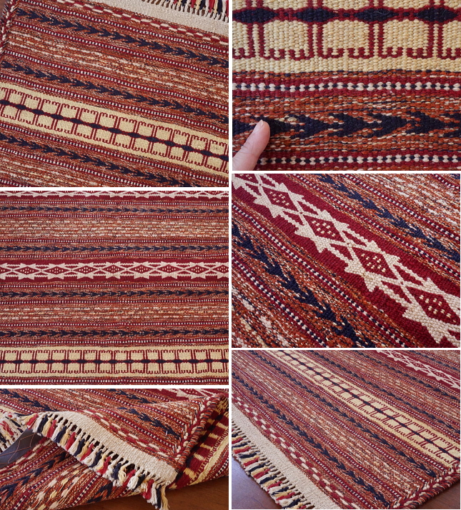 落ち着いた色合いに独特の横縞模様が繰り返される、カラートという小さな町で織られたキリムです。模様の織り出し方が特徴的で、横糸の色を変えるとき糸を折り返さず、表に出ない糸を裏側に渡しておく編み物のような構成になっています。裏表があるかわりにスリット(模様の間の隙間)は全くなく、しっかりと丈夫な質感を持ちます。細かな連続模様が繊細な、上品な印象のキリムです。