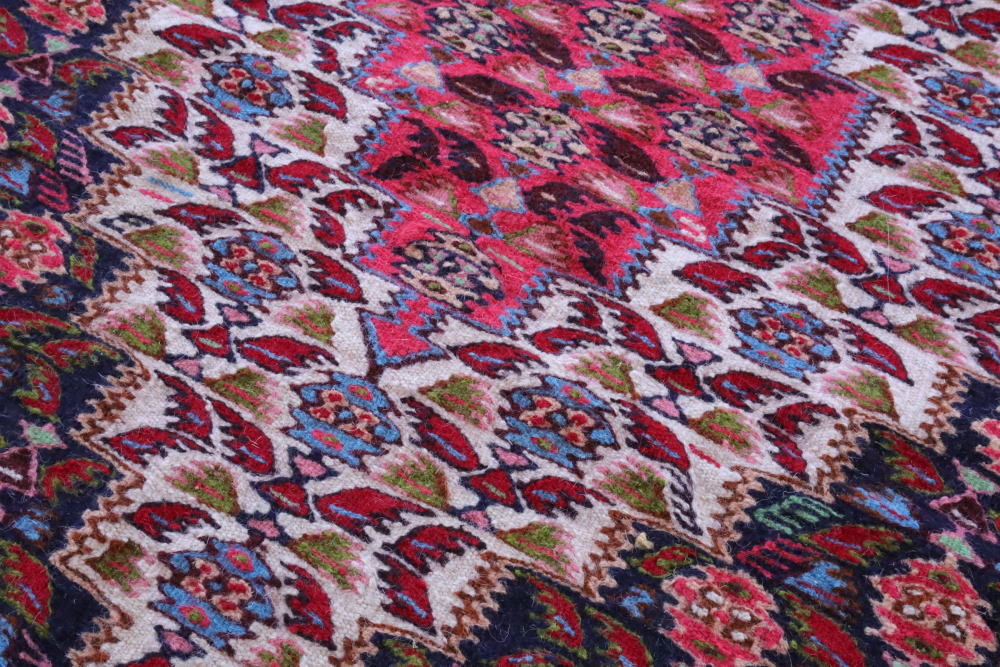 爽やかな水色に縁どられて彩りを増す赤、一面の華やかな花々の中心で、より鮮やかに際立つピンク。細やかな文様が響きあう、イラン北西部・セネの町のキリムです。