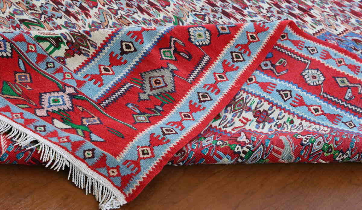 空を映す水色に、太陽の赤、光の白。視界いっぱいに重なっていくひし形の景色は震えるような文様を艶々ときらめかせ、波打ちながら湧き出る魔法の泉のようです。イラン北西部、セネの町で織られたキリムです。
