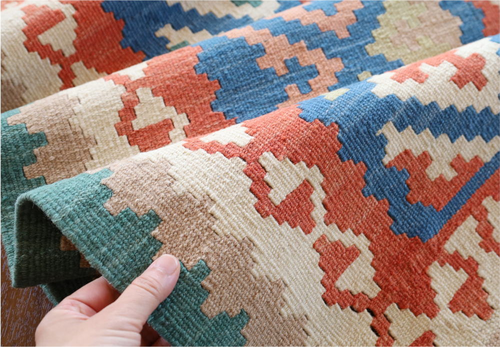 太陽の光が良く似合う、イラン南西部・シーラーズ産のキリムです。ざっくりとした素朴な風合いとカラフルで美しい色合いが特徴で、裏表はありません。丈夫に織られているため、普段使いの敷物としてとても使いやすいキリムです。