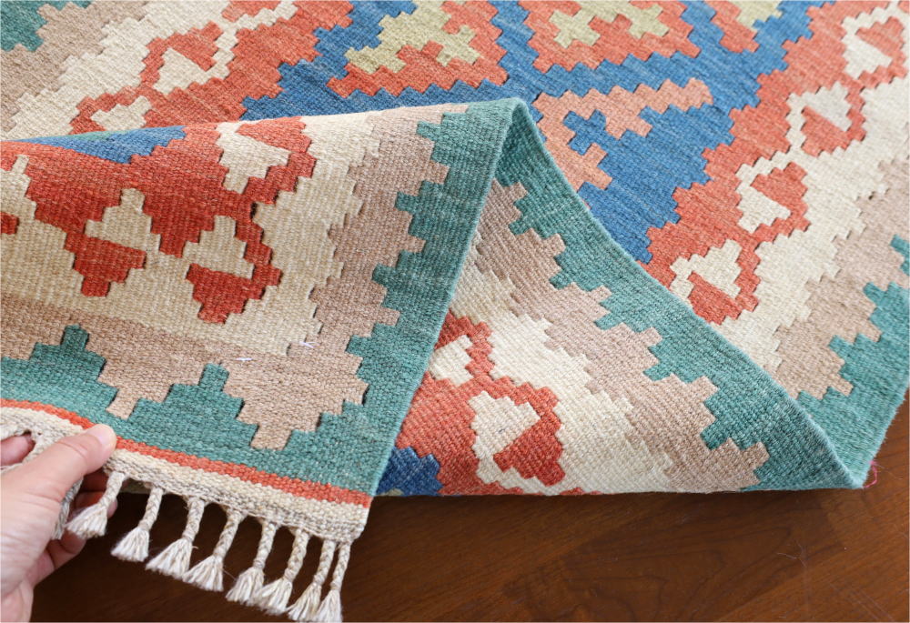 キッチンマットや廊下敷きなどに。しっかりとした手仕事による、丈夫で美しいシーラーズキリムです。