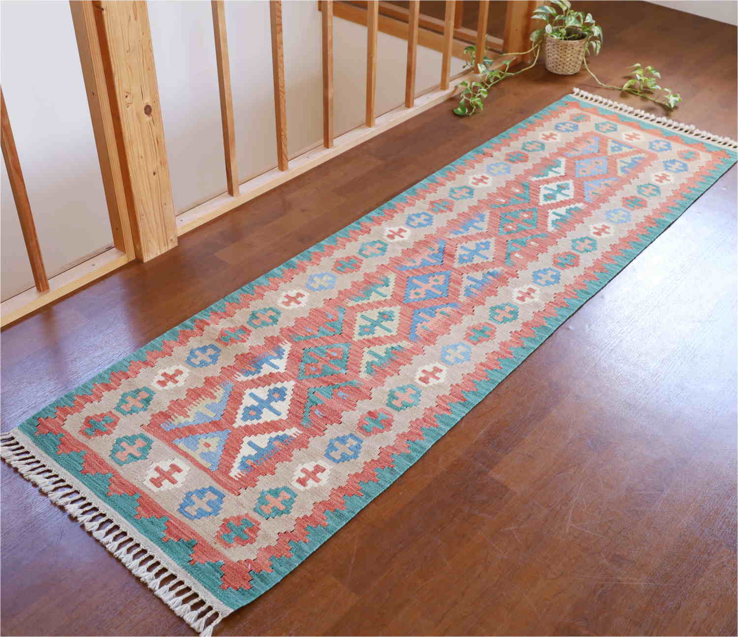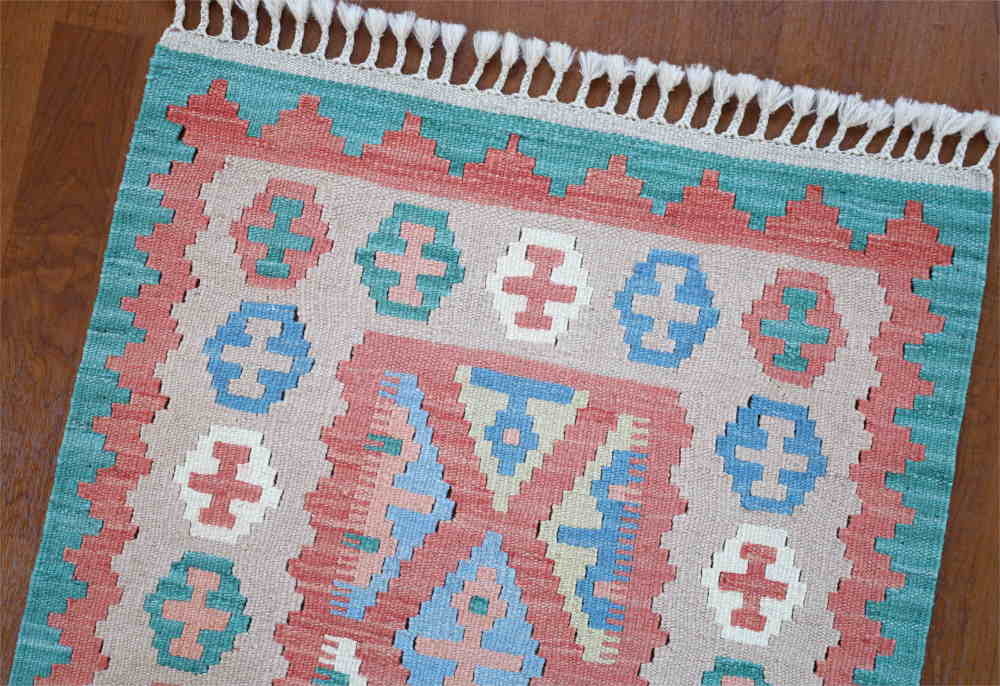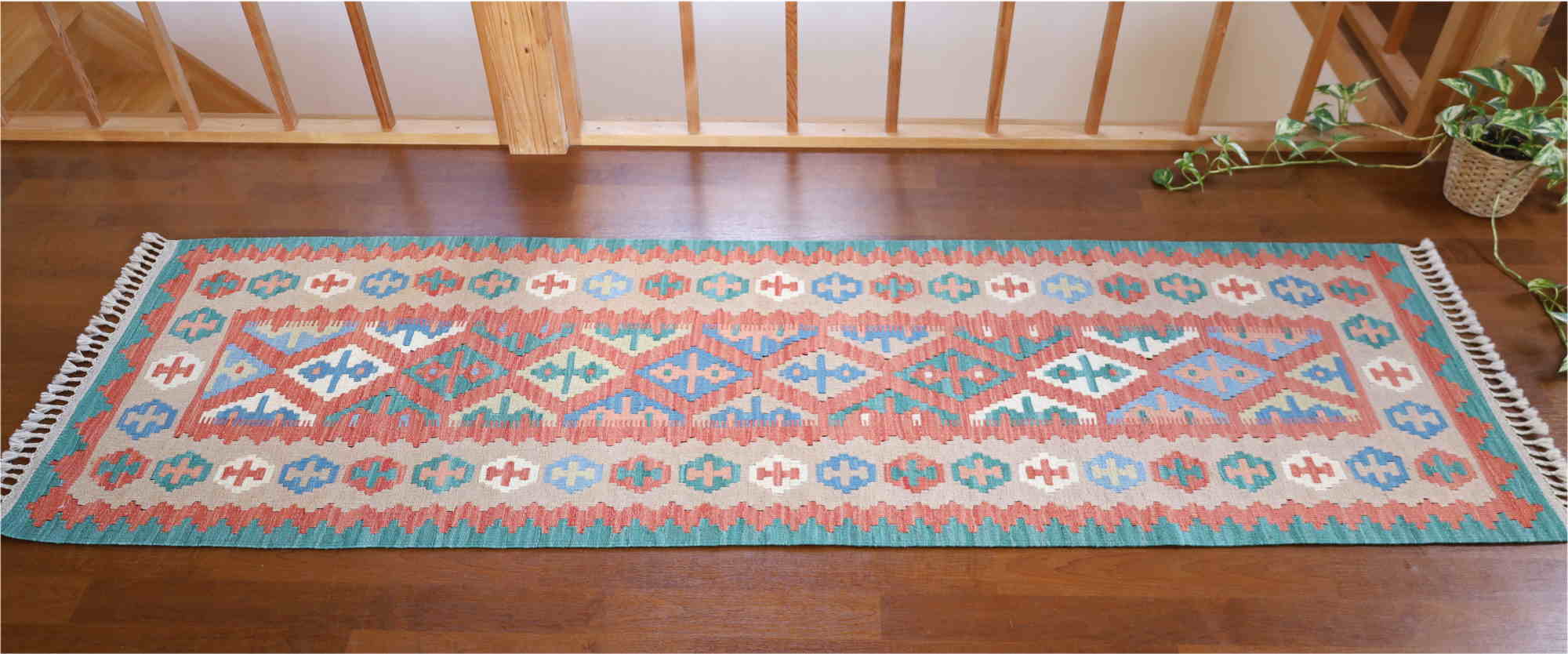 キッチンマットや廊下敷きをはじめ、よく歩く場所のランナーなどに。明るく繊細な表情が床を美しく彩る、細長いシーラーズキリムです。