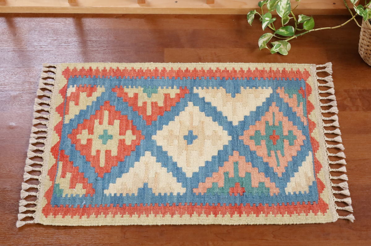 色とモチーフの個性が引き立つ、ミニサイズのシーラーズキリム。玄関マットやタペストリーをはじめ、サイズに合わせてテーブルや椅子の上、素材として活用したりと色々に楽しめるキリムです。
