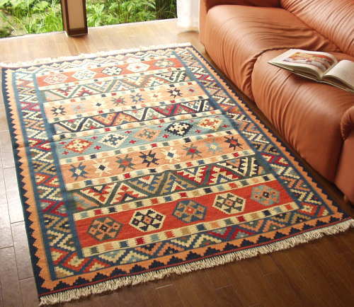 太陽の光が良く似合う、イラン南西部・シーラーズ産のキリムです。ざっくりとした素朴な風合いとカラフルな美しい色合いが特徴で、裏表はありません。丈夫に織られており、気軽にゴシゴシ洗えるので、普段使いの敷物として使いやすいキリムです。 ぱりっとした質感の、丁寧にとてもしっかり織られた一枚。スリット(モチーフの間の隙間)もしっかり締まっています。カラフルなモチーフがいちめんに織り込まれていますが、ユニークな抑えた配色で、さっぱりとした上品な印象です。リビングのアクセント、4人掛けダイニングテーブルの下などに。