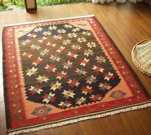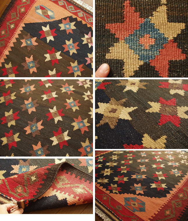 ![]() 星模様の織り込まれた内側のフィールドは、深いこげ茶と藍が混ざり合い、時間とともに変化する夜空のように、上下の端はすっきりと濃い藍色に切り替わっています。列ごとにデザインをそろえた星モチーフは1つ置きに配色を回転させ、瞬いているような効果を与えています。織り目は規則正しくとてもきれいで、大きなスリット(モチーフの間のすき間)はつなぎ止められており、しっかりとした丈夫な質感です。 敷物としての重みも十分あるのでソファー前などに敷いても素敵ですが、壁に飾って絵のようにモチーフを楽しむのも面白い一枚です。白いリネンのベッドの上にタペストリーとして飾れば、星空を見上げるシェエラザードの気分になれるかも知れません・・。 |