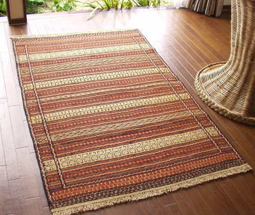 シルジャン地方で編み出された美しく繊細なのモチーフを用いて、カラートという小さな町で織られたキリムです。 このタイプは模様の織り出し方が特徴的で、横糸の色を変えるとき糸を折り返さず、表にでない糸を裏側に渡しておく編み物のような構成になっています。裏表があるかわりにスリット(模様の間の隙間)は全くなく、しっかりした厚みがあります。和風のインテリアにも合わせやすい、落ち着いた色合いと独特の横縞模様が魅力的なキリムです。