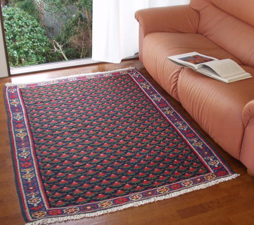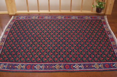 花の上部はどれも白い糸が織り入れられていますが、一輪だけ青く染まったものが混ざっています。全体の質感は薄手でやわらかく、楽に折りたためるほどです。しなやかで重みがあるため床にぺたんとよく納まりますが、ソファーの背もたれや家具などに掛けても使用できるキリムです。 |