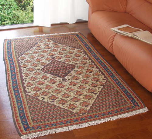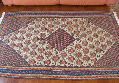 40〜50年程度前に織られて使われていたものですが、穴や補修跡などは特になく、よく観察すると白い部分の下半分ほどには所々に薄いオレンジ色の色にじみが見られます。持ち上げると適度な重みがあり敷物として十分使用できますが、ソファーの背や家具などに掛けてもよく収まる、しなやかな質感のキリムです。
