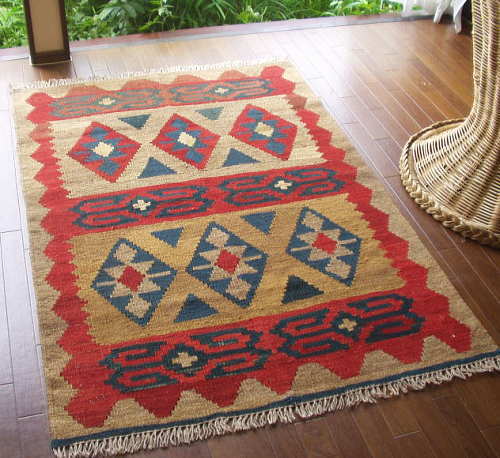 色の濃い無染色の糸を多用した、こくのある色合いの一枚。存在感の強い柄行ですが、地色が渋いので写真のような床色から濃い床色までよく馴染みます。壁に貼ると少し暗く感じますが、あえてタペストリーした場合インパクトのある、面白い見栄えになりそうです。 |