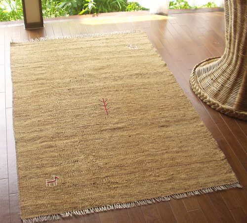 茶にこげ茶が混ざり合うやわらかな色合いの地に、かわいらしいヤギと木が織り入れられています。と、思いきや、裏返すとなんとまっさら、モチーフがありません!・・・裏側に糸の出ない方法のジジム織りで、裏表違った雰囲気を楽しめる、“リバーシブル”デザインのキリムです。太い糸でざっくり柔らかに織られ、フローリングにちょっと何か、という時にもゴザのような気軽さで使えます。麦茶のお盆がよく似合う、ナチュラルな時間をすごせそうなキリムです。 |