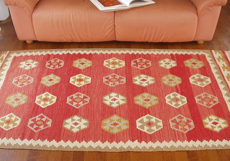 ![]() 未使用のキリムですが右上の端付近に、指を3本あてた程度の大きさの、しみのように色の暗い部分があります。(部分写真左上/右端一番上の白いモチーフの左上部分。薄いので気づきにくくなっています。)厚みは十分ありますが持ち上げると比較的軽く、さっぱりとした使い心地です。上下のフサの近くには少し太い糸で飾り織りが施され、素朴な中にキリムやそれを使う家族への愛着が伝わってくるようです。 ソファー前のほか、ベッドサイドやちょっとしたスペース作りに面白い、少し縦長サイズのキリムです。 |