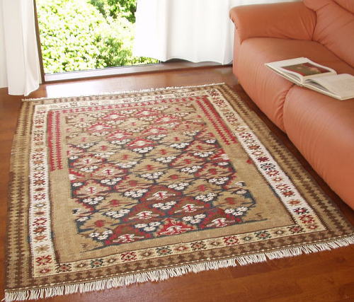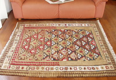 また、端から3番目の連続模様は上半分はえんじと薄茶で織り分けられているのに、中ほどからほぼ同色の糸のみで続けられています。補修ではなく当初からのもので、コットンを差しいれたのと同様織り手のウィットか、糸の残量など何らかの都合によるものと思われます。その他あちこちに見られる配色の切り替えとともに、全体の何とも言えない色バランスの魅力と、のびのびと思うままに織りあげられるキリムの面白さを感じます。下の端の織り足し部分以外に目立つ傷みや補修部分はありません。全体の質感は重くしなやかで、床にペタンとよく落ち付きます。ソファー前や部分ラグなどに、美しくも合わせやすいキリムです。 |