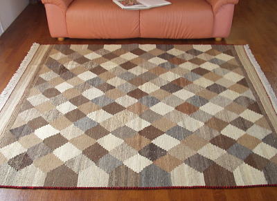 ![]() 不揃いな毛足が細かな凸凹を生むため表面はざらりとした手触りで、手作業の素朴な味わいを強く感じます。踏みしめるごとに目が締まり、落ち着いていく表面はだんだんと糸の艶とこしが増し、通常のキリム以上に使い込まれたあとの美しさが期待されます。 リビングやダイニングの家具に合わせやすい、正方形に近いサイズです。自然のめぐみをそのまま敷物にしたような、贅沢な品質のキリムです。 |