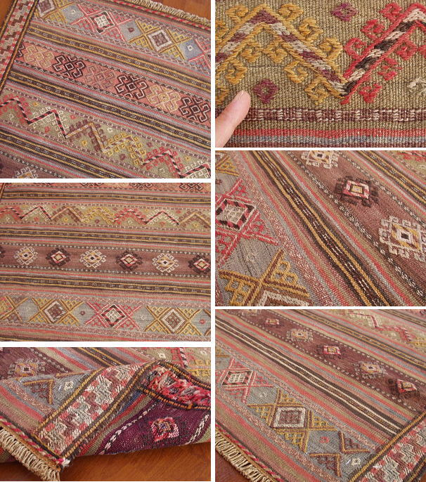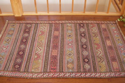 ![]() 表面はキリム特有の毛羽立ちがこすれてさらりとした手触りになっており、少し立体的に盛り上がったジジム織り部分の糸がよりやわらかな感触を与えます。織り地はぺらりと薄手ですが、両端の飾り織り部分の厚みが全体にしっかりとした落ち着きを感じさせます。ジジム織り部分に特に気にならない程度の擦り切れは見られますが、他に傷みや穴などはありません。 ソファーの前などの部分ラグとして。ゆったりとした音楽のような、優美な色模様が楽しめるオールドキリムです。 |