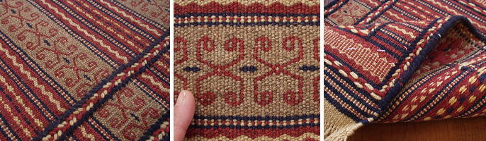 模様の織り出し方が特徴的で、横糸の色を変えるとき糸を折り返さず、表にでない糸を裏側に渡しておく編み物のような構成になっています。裏表があるかわりにスリット(模様の間の隙間)は全くなく、しっかりと丈夫な質感です。細かな連続模様が繊細な、上品な印象のキリムです。