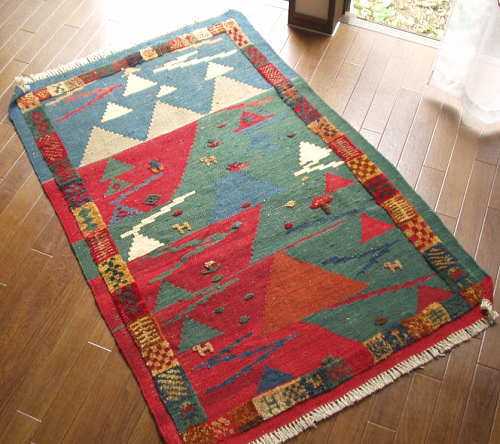 山と地平線で区切られた青い空、下に広がる広い草原が夏を思わせるギャッベキリムです。 カラフルなモチーフが繰り返されるフレームのような絨毯織には、よく見るとヤギや女の子も織り込まれています。平織り部分の起毛したモチーフはどれも小さく、風景を遠くから眺めるような印象を与えています。 織り目はざっくりとした普通程度の出来栄えで、全体の形は右側が少し膨らんでいます。日に焼けたような茶色みがあり、渋めの落ち着いた色合いになっています。 タペストリーや部分敷き、大き目の玄関マットなどに。