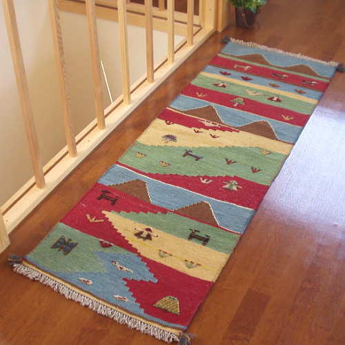 遊牧民の生活の様子を子供の絵のようなあどけないタッチで織り込めたギャッベキリム。子供や動物などのモチーフにパイルを結んだ絨毯織りが用いられ、そこだけフカフカと毛足があるのが特徴です。