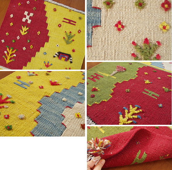 遊牧民の生活の様子を子供の絵のようなあどけないタッチで織り込めたギャッベキリム。子供や動物などのモチーフにパイルを結んだ絨毯織りが用いられ、そこだけフカフカと毛足があるのが特徴です。