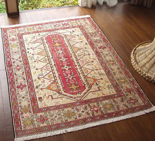 パイルのあるシルク絨毯のような派手さはありませんが、じんわりと光沢のある表面は光がさすとまぶしいほどに輝きます。お客様を迎える玄関や、美しい空間作りに敷物としてはもちろん、タペストリーとしても美しく映えるキリムです。ほのかな色むらをたたえた甘みのある赤が柔らかな、やさしい色合いの一枚。はっきりとした華やかなモチーフの間を、繊細な動物モチーフが埋めています。 |