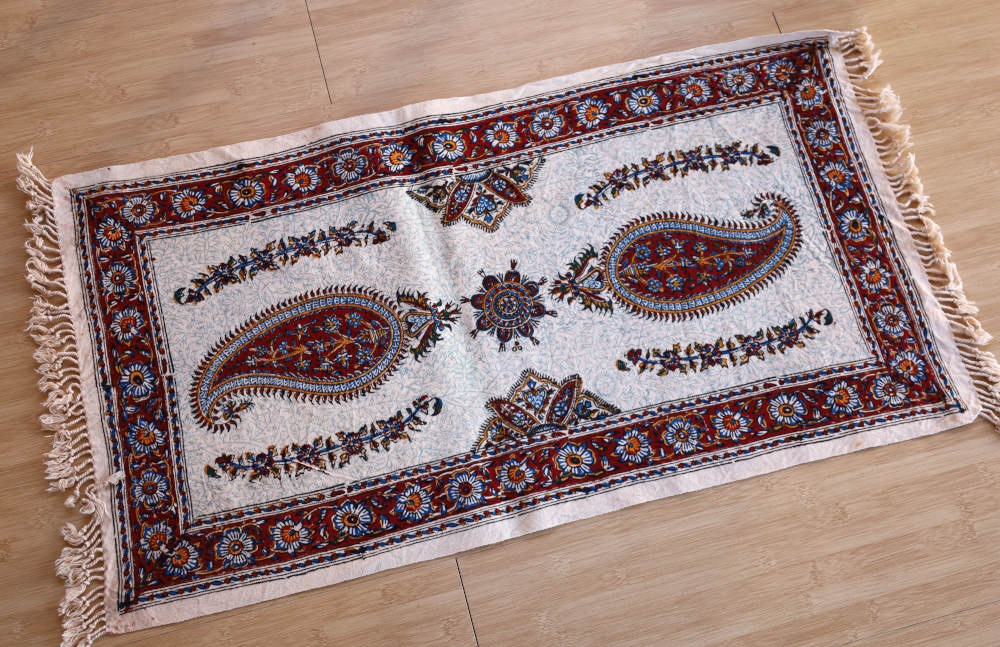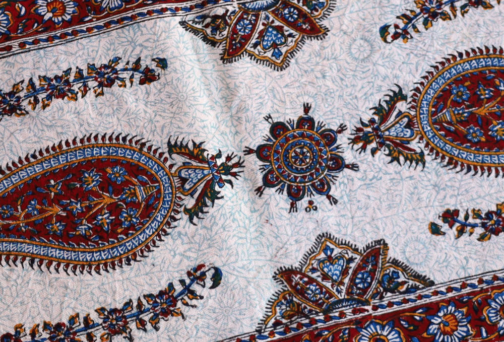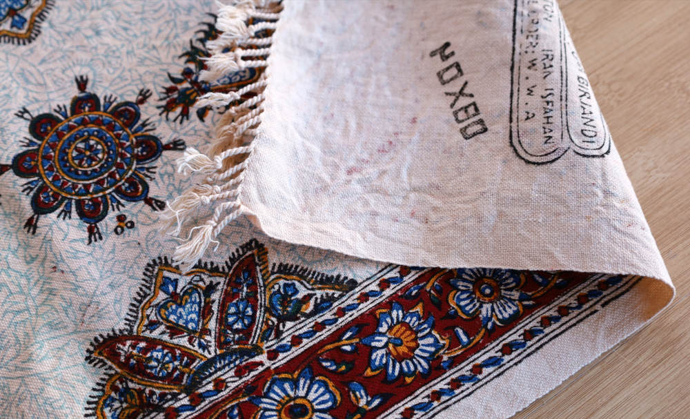 イランの古都、イスファハーンで作られるペルシャ更紗のテーブルセンター。美しい文様は木版で一枚一枚手作業で染められます。ほどよい厚みのある丈夫なコットン生地で、洗濯機で気軽に洗えるのも魅力のひとつ。