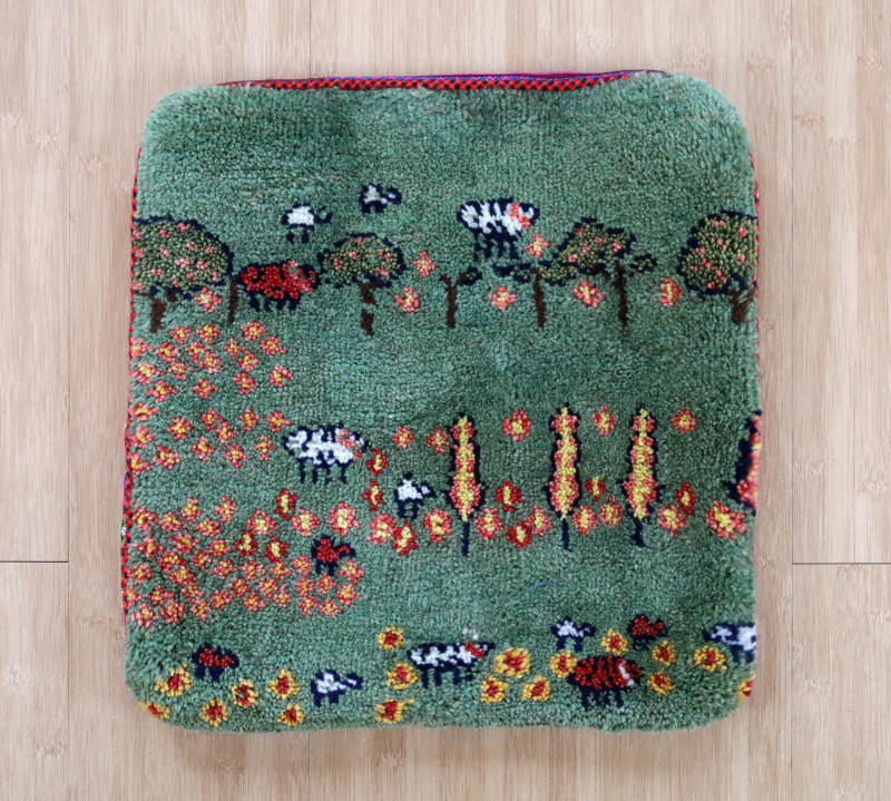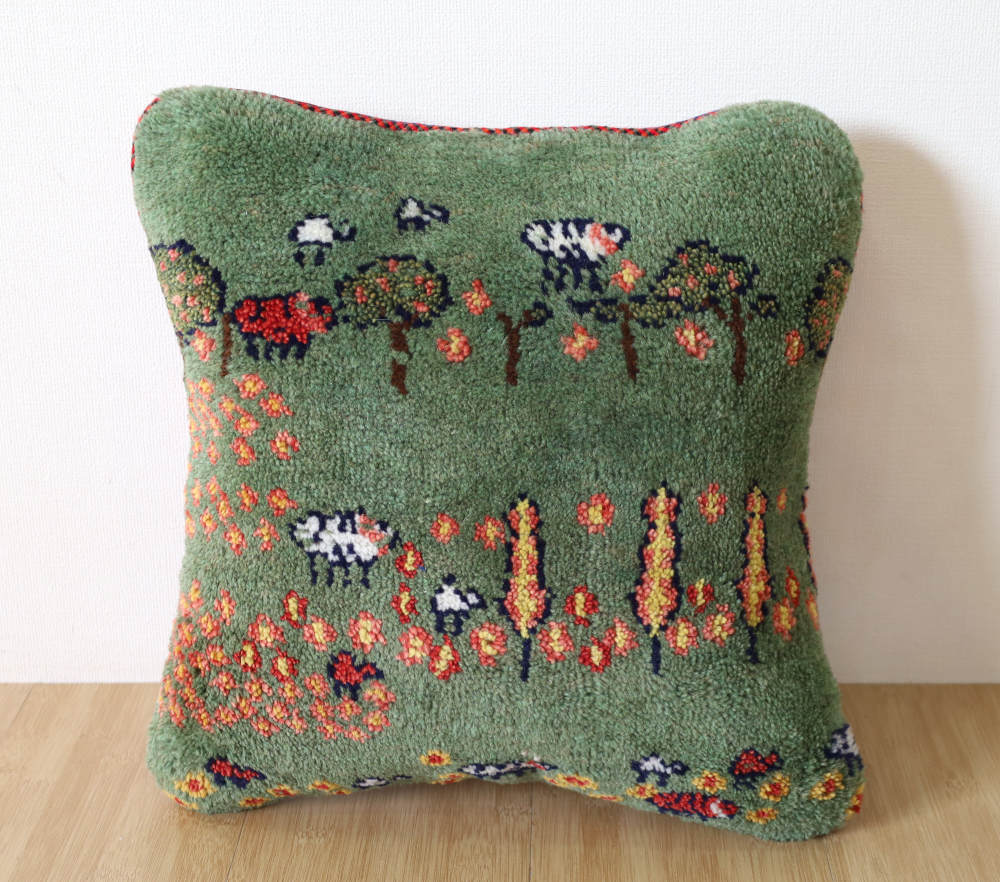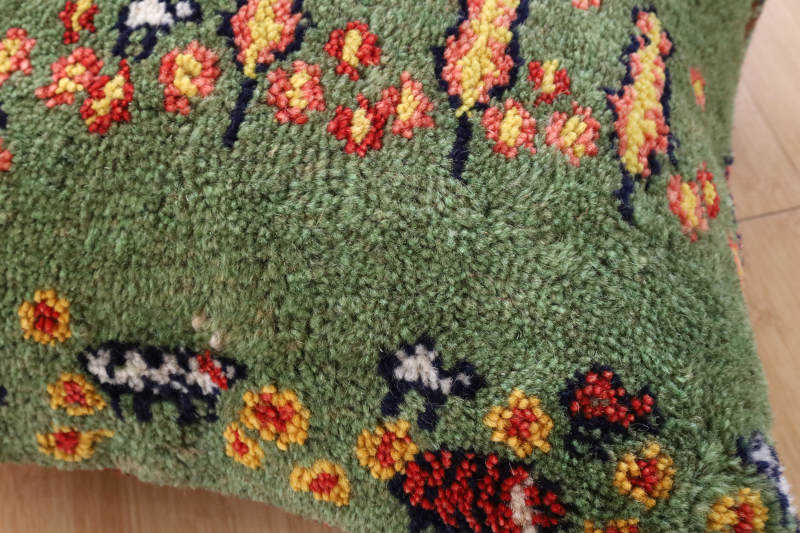 毛足のあるやわらかなギャッベ絨毯でクッションカバーを作りました。クッションを詰め込むとコロンと丸く、ふかふかとした毛足がぬいぐるみのようです。くつろぎタイムのお供やソファーのアクセサリーなどに。