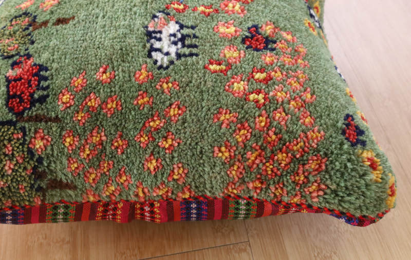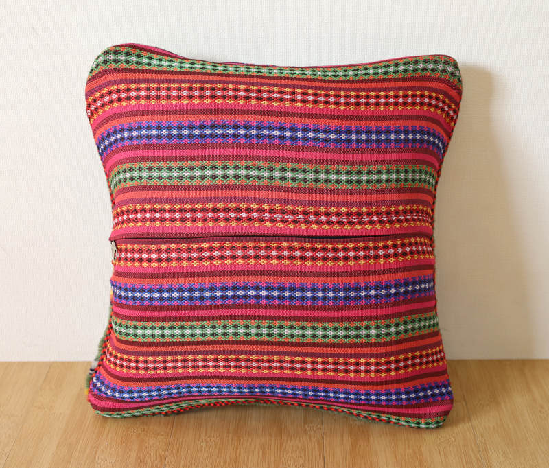背面は機械織りのジャジム(薄手の織物)が使用されています。ギャッベ側の内側には布や不織布の裏地が縫い合わされています:ご参考→写真最下段(このクッションカバーと同仕様の別の商品の画像です)